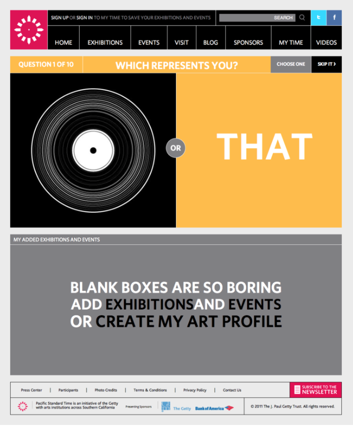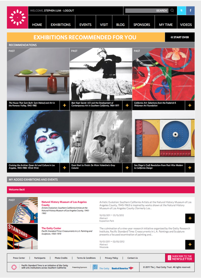 The Pacific Standard Time website was the hub of this region wide event, with all the museums and exhibitions in one place. It gave visitors the tools, search options and personalized recommendation functionality to help them navigate their way around the hundreds of programs associated with Pacific Standard Time.