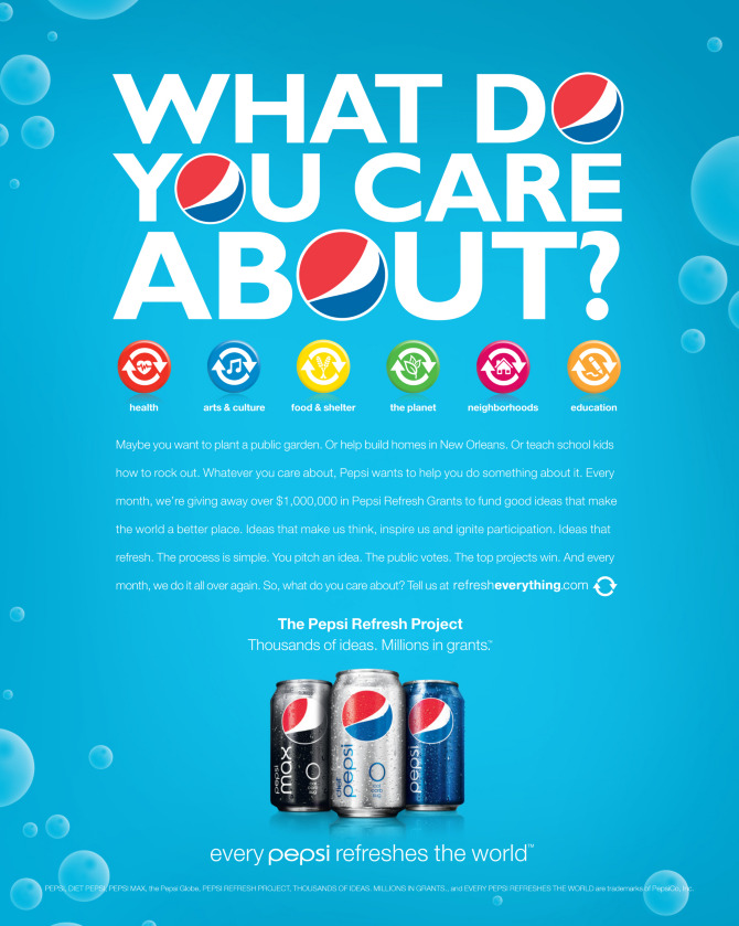 We took $20MM of Pepsi's Super Bowl budget and gave it away in the form of grants to refresh the world. We created the Pepsi Refresh Project platform as a way to invite people to submit and vote for ideas that help make the world a better place.